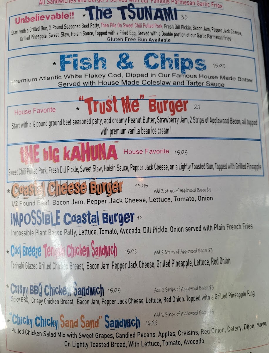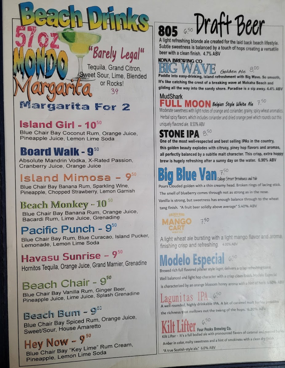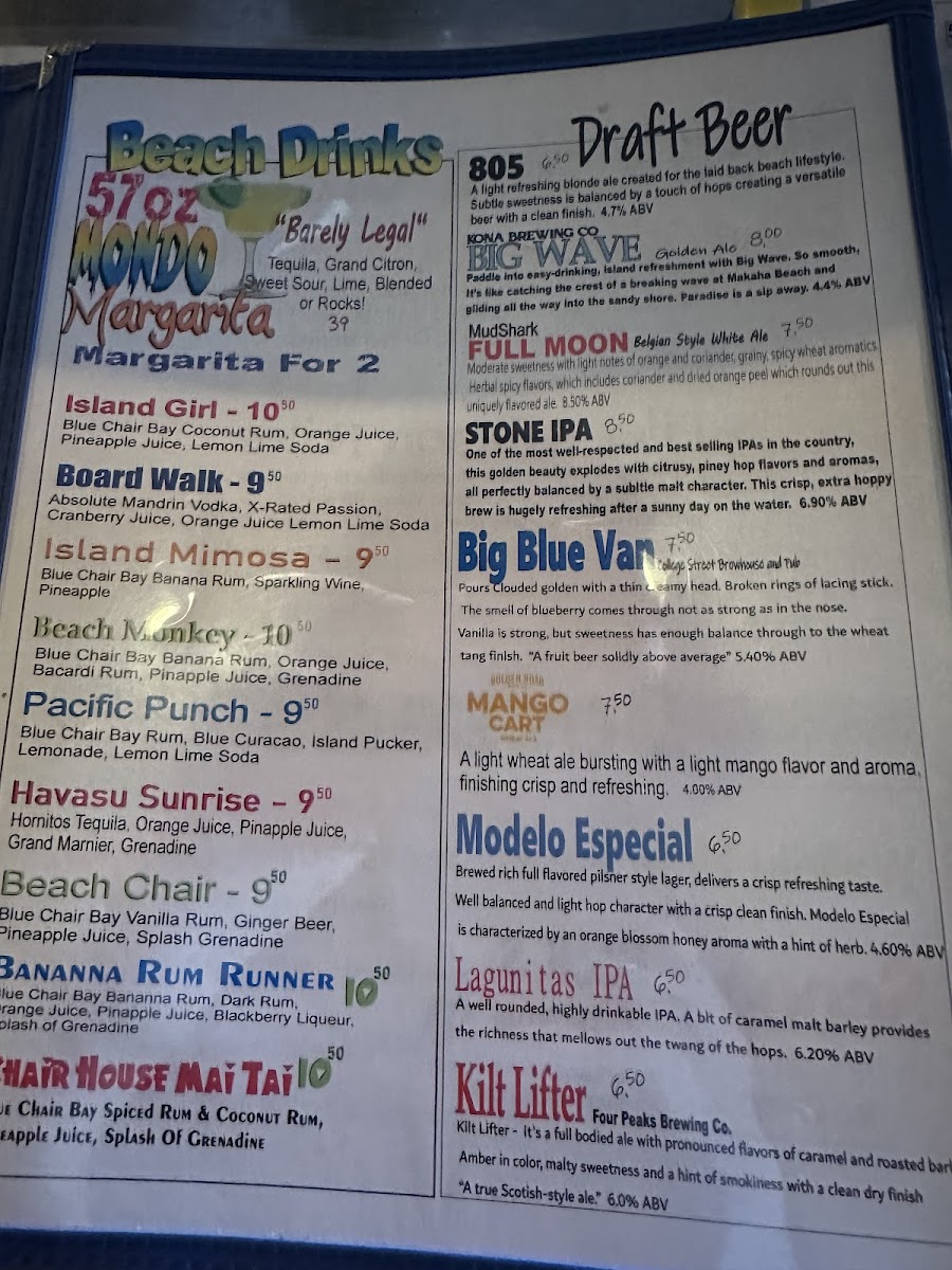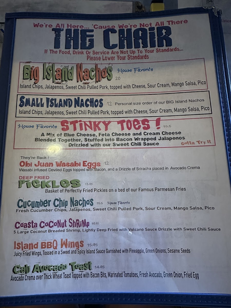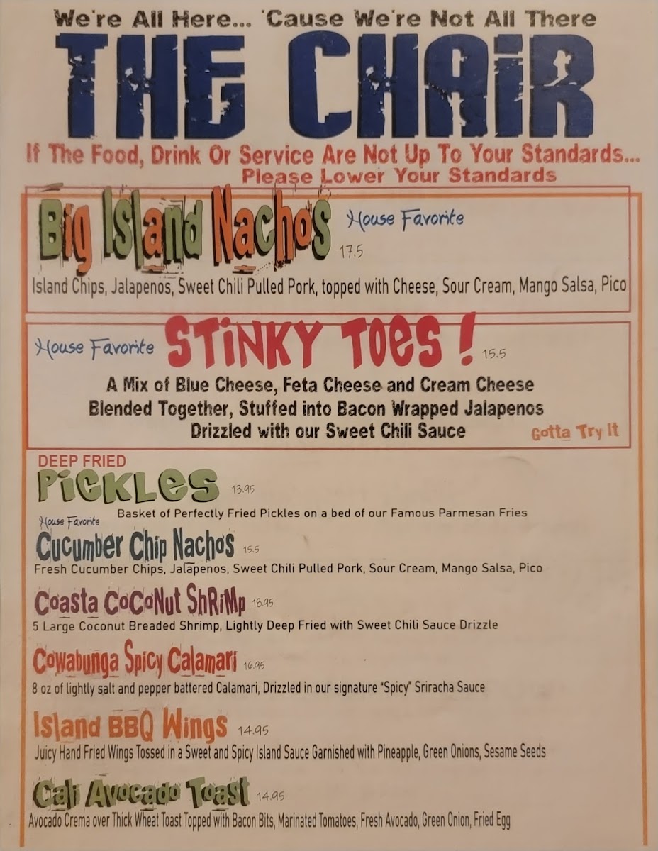 The menu at The Chair in Lake Havasu City offers a diverse and flavorful selection of dishes perfect for a variety of tastes. For starters, the Hang Ten Bacon Board ($13.00) is a standout with its candied bacon drizzled in apple cider and chocolate, complemented by a spicy kick of jalapeno. The Big Wave Brie Board ($12.00) features creamy brie paired with mango fruit salsa, served with crunchy baguette slices. For those craving a more savory bite, the Triple Fin Hummus Board ($14.00) offers a choice of traditional, roasted red pepper, and garlic hummus alongside fresh veggies. The Toes On The Nose - Tostones ($14.00) brings a Caribbean flair, with crispy fried plantains topped with sweet chili jerk pulled pork, avocado crema, and cilantro. The BC Burger Slider Skewers ($11.00) are a must-try, with three mini burgers drizzled with house bacon jam, charred pineapple, and hoisin sauce, making for a deliciously unique treat. For a heartier meal, the Big Island Nachos and the Big Kahuna are both priced at $15.00, offering generous portions with tropical flavors. Those looking for lighter options can opt for the So Cal Fit Wrap ($13.00) or the Chicky Chicky Sand Sand ($13.00), both packed with fresh ingredients. Finally, the Caribbean Poke ($16.00) provides a flavorful fish option with a tropical twist. Whether you're in the mood for something bold and spicy or light and refreshing, The Chair’s menu offers a well-rounded selection sure to satisfy any craving.