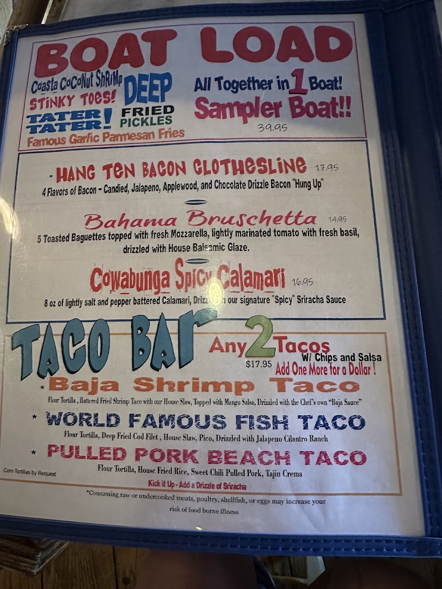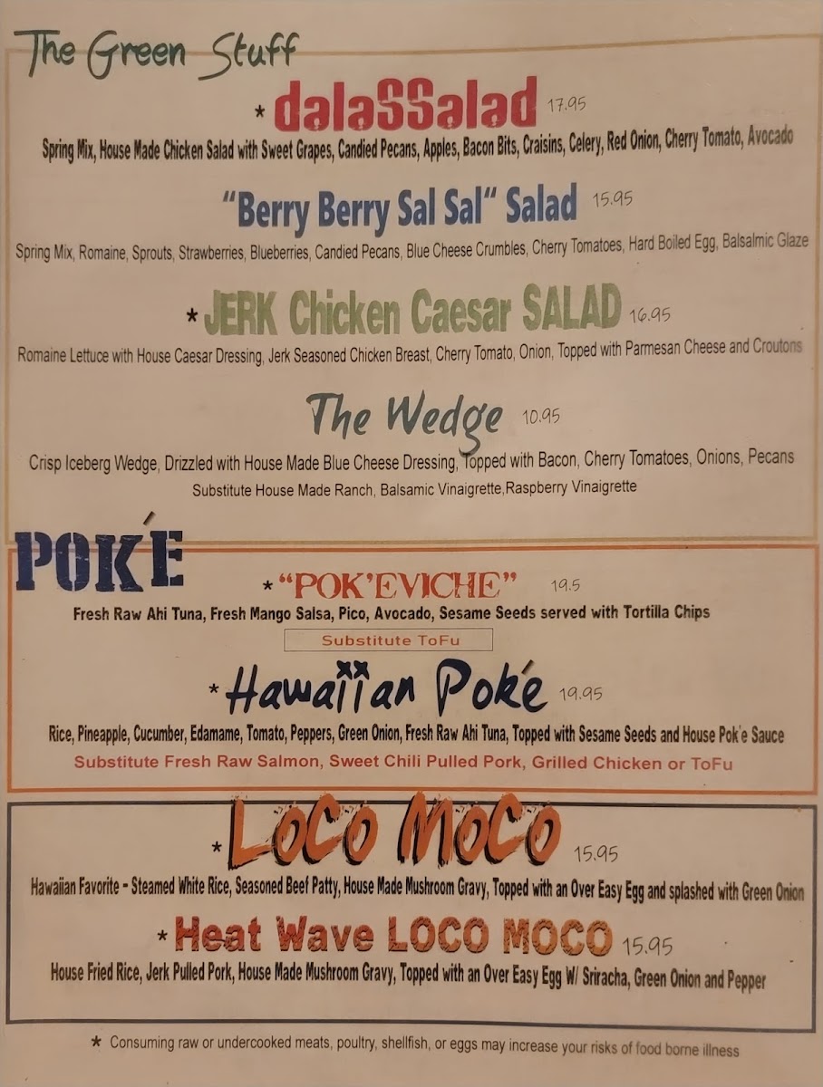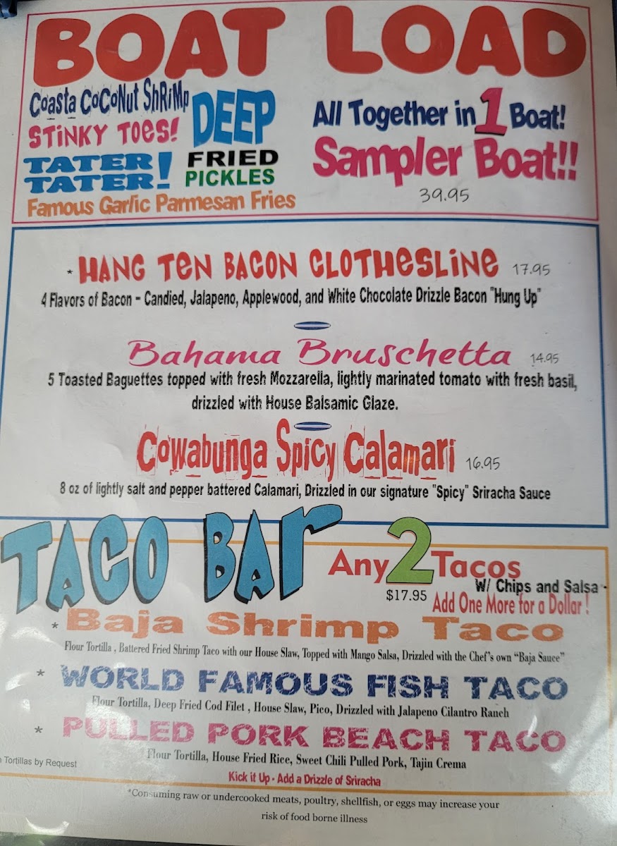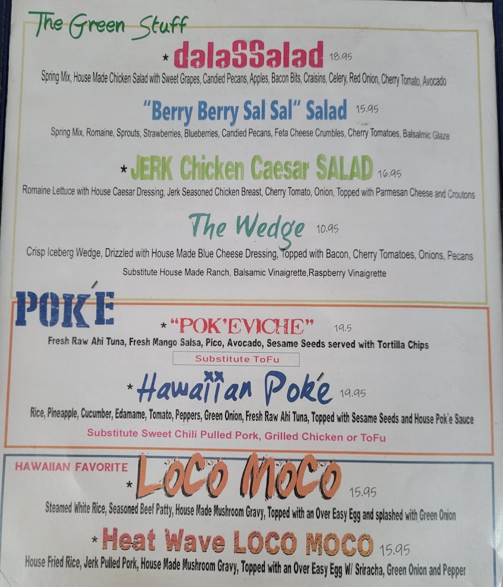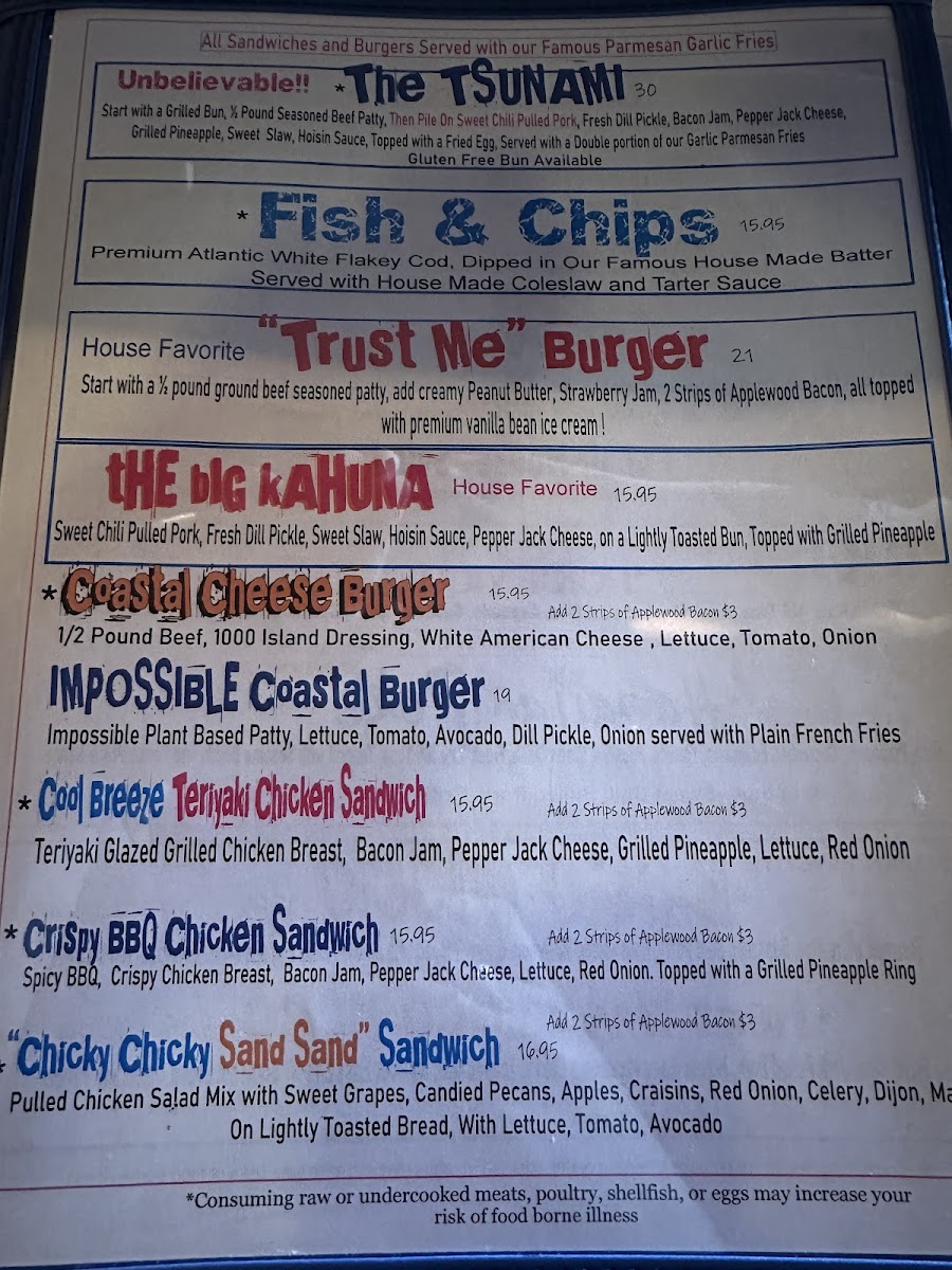 The menu at The Chair in Lake Havasu City offers a diverse and flavorful selection of dishes perfect for a variety of tastes. For starters, the Hang Ten Bacon Board ($13.00) is a standout with its candied bacon drizzled in apple cider and chocolate, complemented by a spicy kick of jalapeno. The Big Wave Brie Board ($12.00) features creamy brie paired with mango fruit salsa, served with crunchy baguette slices. For those craving a more savory bite, the Triple Fin Hummus Board ($14.00) offers a choice of traditional, roasted red pepper, and garlic hummus alongside fresh veggies. The Toes On The Nose - Tostones ($14.00) brings a Caribbean flair, with crispy fried plantains topped with sweet chili jerk pulled pork, avocado crema, and cilantro. The BC Burger Slider Skewers ($11.00) are a must-try, with three mini burgers drizzled with house bacon jam, charred pineapple, and hoisin sauce, making for a deliciously unique treat. For a heartier meal, the Big Island Nachos and the Big Kahuna are both priced at $15.00, offering generous portions with tropical flavors. Those looking for lighter options can opt for the So Cal Fit Wrap ($13.00) or the Chicky Chicky Sand Sand ($13.00), both packed with fresh ingredients. Finally, the Caribbean Poke ($16.00) provides a flavorful fish option with a tropical twist. Whether you're in the mood for something bold and spicy or light and refreshing, The Chair’s menu offers a well-rounded selection sure to satisfy any craving.